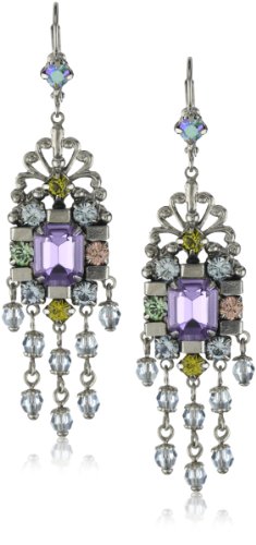 Inspired by the cool tones and calmness of water, the Sorrelli "Running Water" Crystal Drop Silver-Toned Earrings with Fringe combine elegant beauty with sophisticated style. Each French wire holds a brilliant light violet crystal accented by smaller stones in light green, violet, pink, and yellow-gold. A scrolled silver design adorns the top of the stone, while faceted crystal beads dangle beneath to create "fringe." Measuring 2.75 inches, these chandelier-style earrings will hang well below your lobes for dramatic impact.