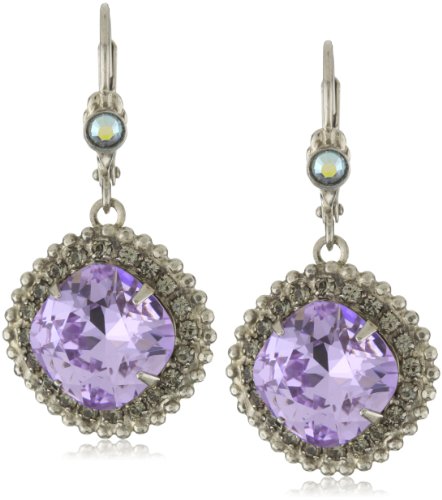 A sparkly oval-shaped amethyst-shaded crystal lies at the center of the Sorrelli "Chantilly Lace" Cushion-Cut Dangle Silver-Toned Earrings. This intriguingly faceted stone is framed by two perimeters of light and dark silver brass. There's a beaded outer layer, plus an inner layer studded with a bevy of round grey crystals. These lever-back earrings measure .75 inch wide and 1.5 inches long.